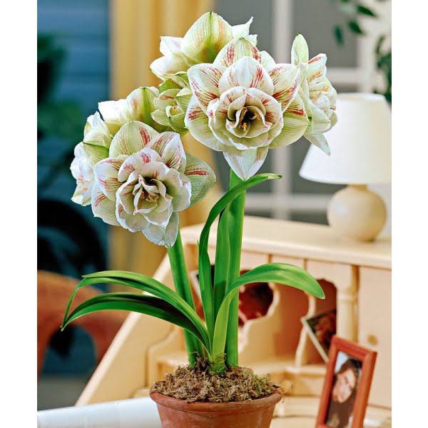 Amaryllis bulbs produce tall, sturdy stems that bear large, lily-like flowers. The blooms come in an array of colors, including rich reds, pinks, whites, and bi-color variations, captivating observers with their bold and elegant presence. Known for their ease of care and ability to bloom indoors during the winter, Amaryllis bulbs have become synonymous with festive and celebratory occasions.