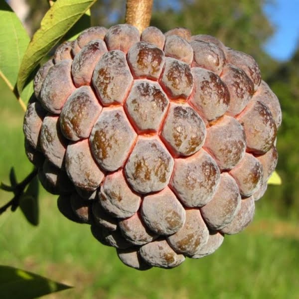Custard apple, also known as sugar apple or cherimoya, is a tropical fruit known for its creamy, custard-like texture and sweet flavor. It has a green, scaly skin and soft, white flesh with black seeds.