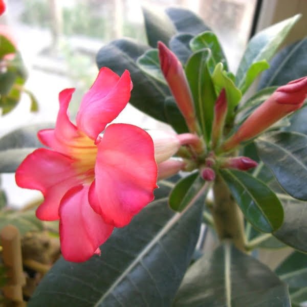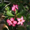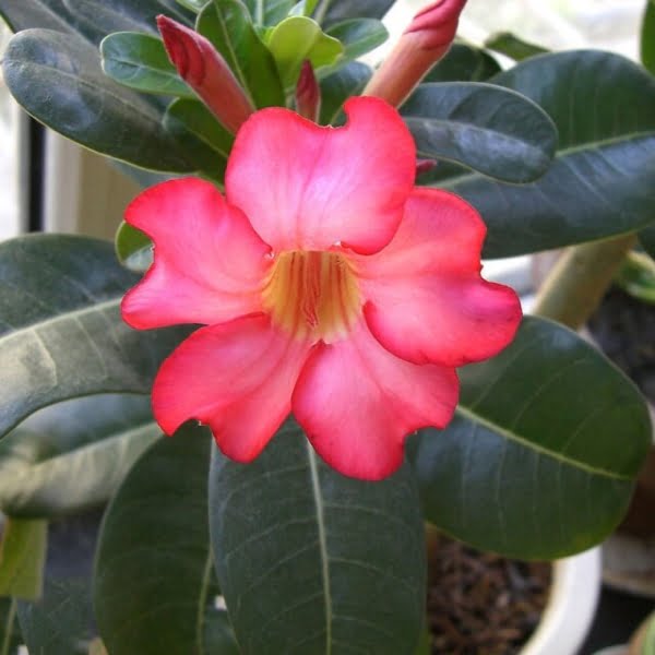 The plant produces clusters of showy, trumpet-shaped flowers in various colors, including shades of pink, red, and white. With its sculptural form and striking blooms, the Desert Rose is a popular choice for adding beauty to gardens, patios, and indoor spaces, bringing a touch of exotic elegance to any environment.